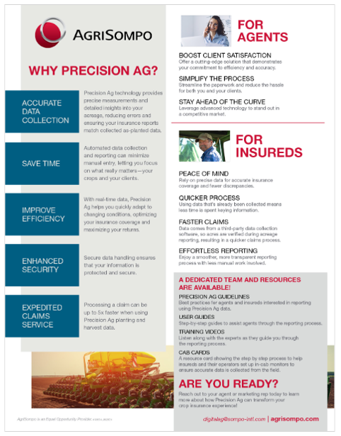 Our Precision Ag Flyer provides an easy overview of the precision agriculture process and the benefits it holds for your policyholders.
