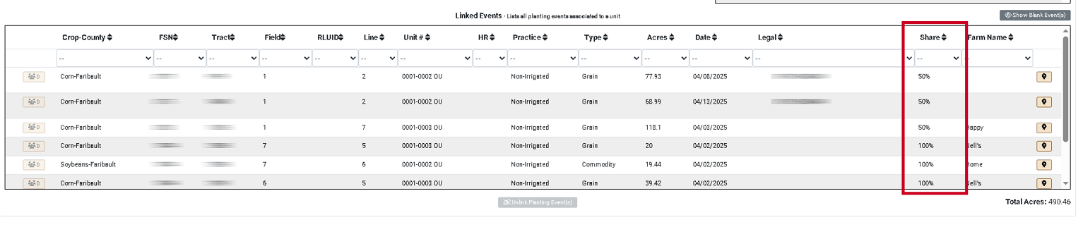 Finally, the Reconciliation screen will now list the share percentage for each planting event for easy reference.