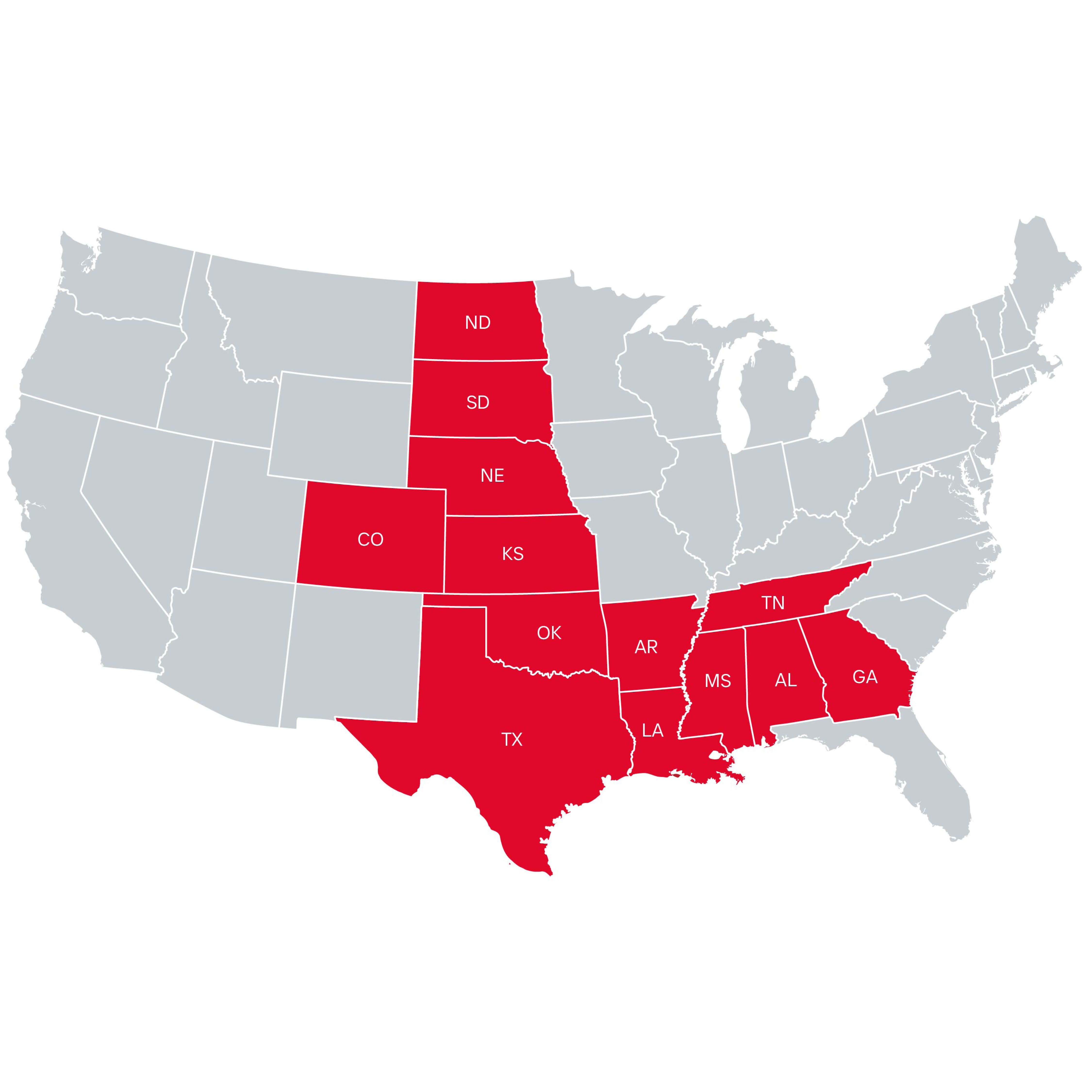 Throughout Alabama, Arkansas, Colorado, Georgie, Kansas, Louisiana, Mississippi, Nebraska, North Dakota, Oklahoma, South Dakota, Tennessee and Texas.