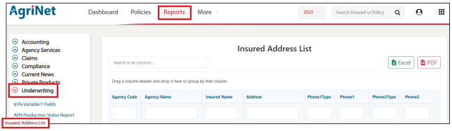 This report can be found under the Reports tab. Open the Underwriting menu and select Insured Address List. The report may be exported into an Excel or PDF document. AgriSompo thanks you for your cooperation and assistance.